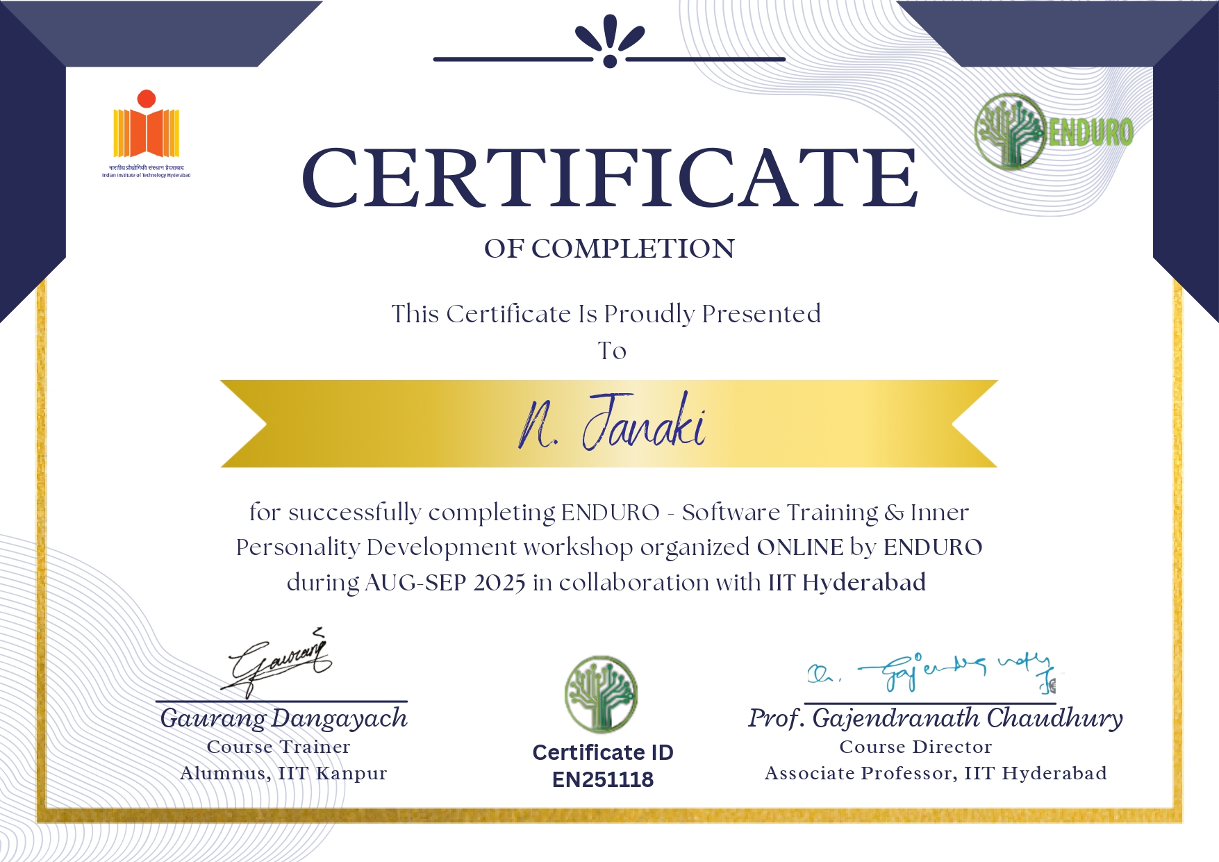 Hi! Iβm Janaki, a first-year Computer Science student with a strong interest in web development and technology. I enjoy learning by building projects, experimenting with new ideas, and improving my skills step by step. Iβm currently focused on strengthening my foundations in programming and exploring different areas of tech to discover where my passion truly lies.